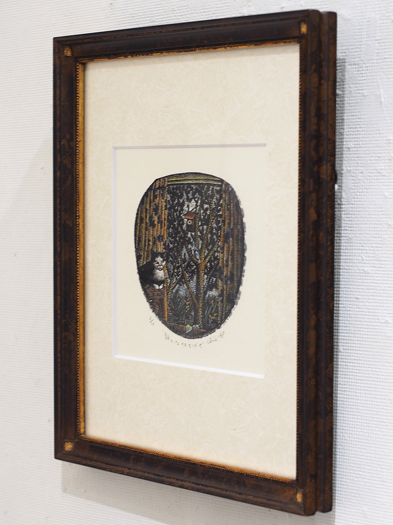 作品名:静かな待ち伏せ作家名:林千絵素材:木口木版、手彩色、雁皮紙価格:シート¥12,100(税込) 額付¥16,100(税込)