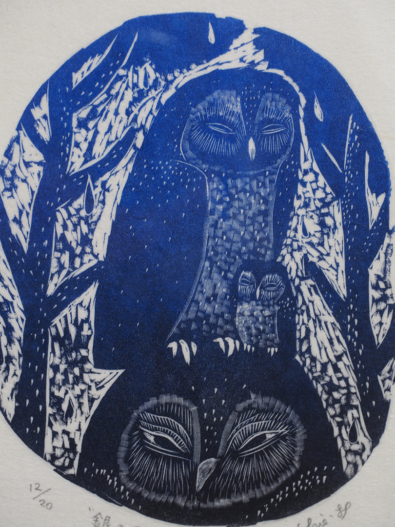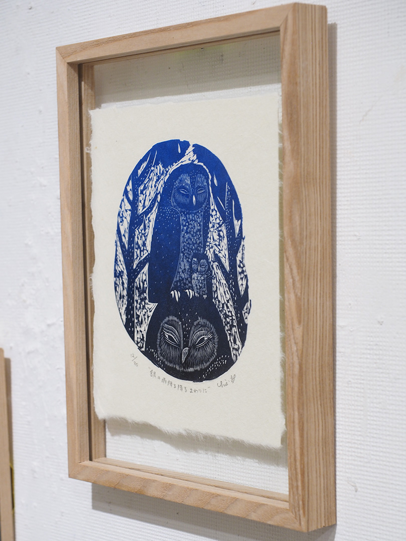 作品名:銀の雨降る降るまわりに作家名:林千絵素材:木口木版、手彩色、雁皮紙価格:シート¥12,100(税込) 額付¥15,100(税込)