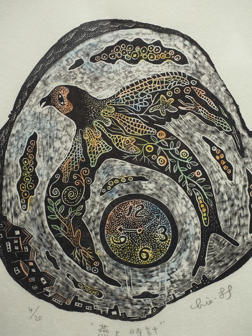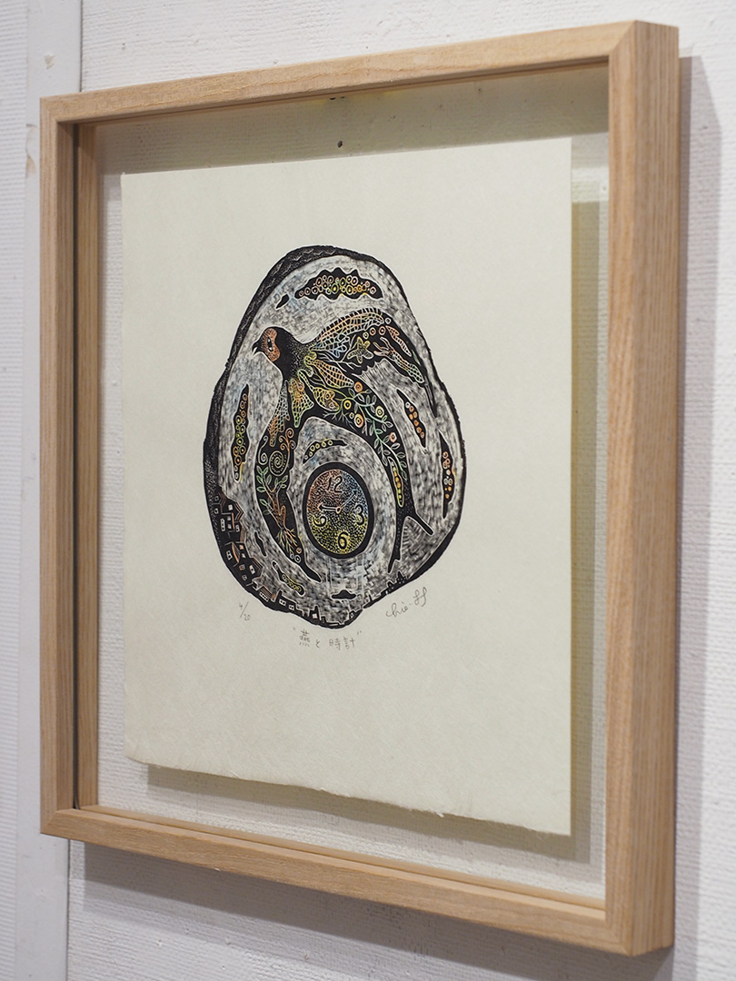 作品名:燕と時計作家名:林千絵素材:木口木版、手彩色、雁皮紙価格:シート¥15,400(税込) 額付¥20,400(税込)