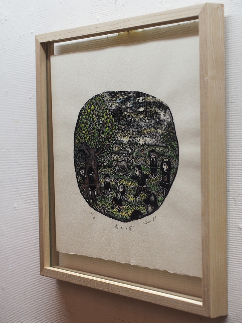 作品名:遊びの国作家名:林千絵素材:木口木版、手彩色、雁皮紙価格:シート¥17,600(税込) 額付¥22,600(税込)