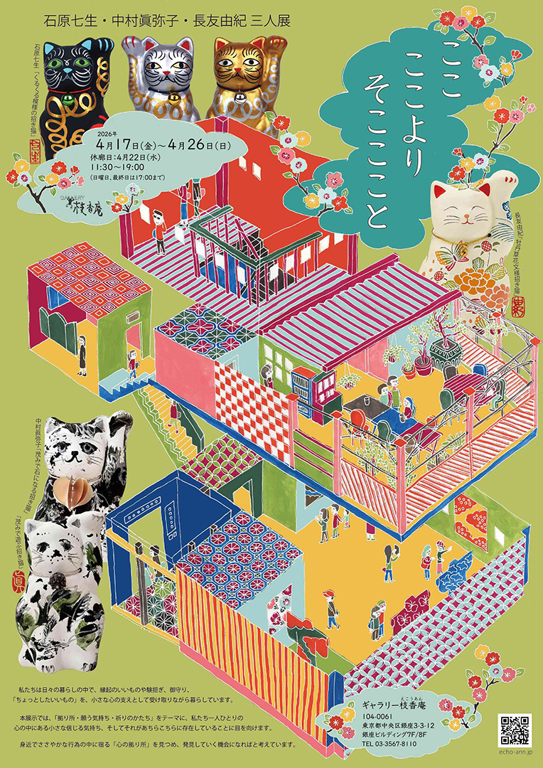 私たちは日々暮らしの中で、縁起のいいものや験担ぎ、御守り、「ちょっとしたいいもの」を、小さな心の支えとして受け取りながら暮らしています。 本展示では、「拠り所・願う気持ち・祈りのかたち」をテーマに、私たち一人ひとりの心の中にある小さな信じる気持ち、そして それがあちらこちらに存在していることに目を向けます。 身近でささやかな行為の中に宿る「心の拠り所」を見つめ、発見していく機会になればと考えています。